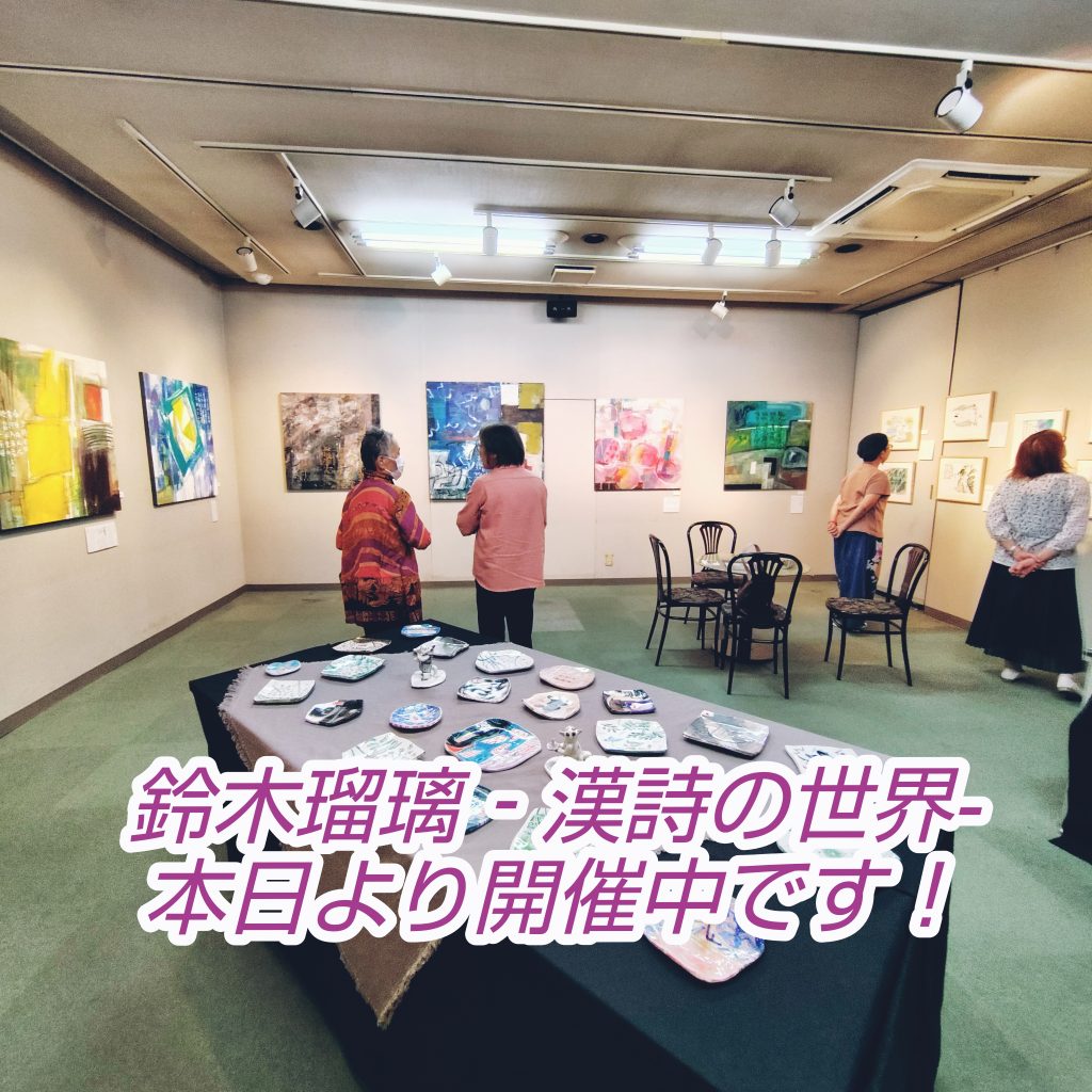 鈴木瑠璃‐漢詩の世界-本日より開催です。東松山が生んだ漢詩人嵩古香の漢詩の世界に魅了された鈴木瑠璃さん。嵩古香や唐の時代の漢詩からインスピレーションを受け、自身の抽象絵画との融合した作品を発表されています。油彩、アクリル、陶器の作品約50点の展示販売です。なかなか漢詩に馴染みがない方にも、絵と共に楽しんで見ていただきたい展覧会です。皆様のご来廊をお待ち致しております。
